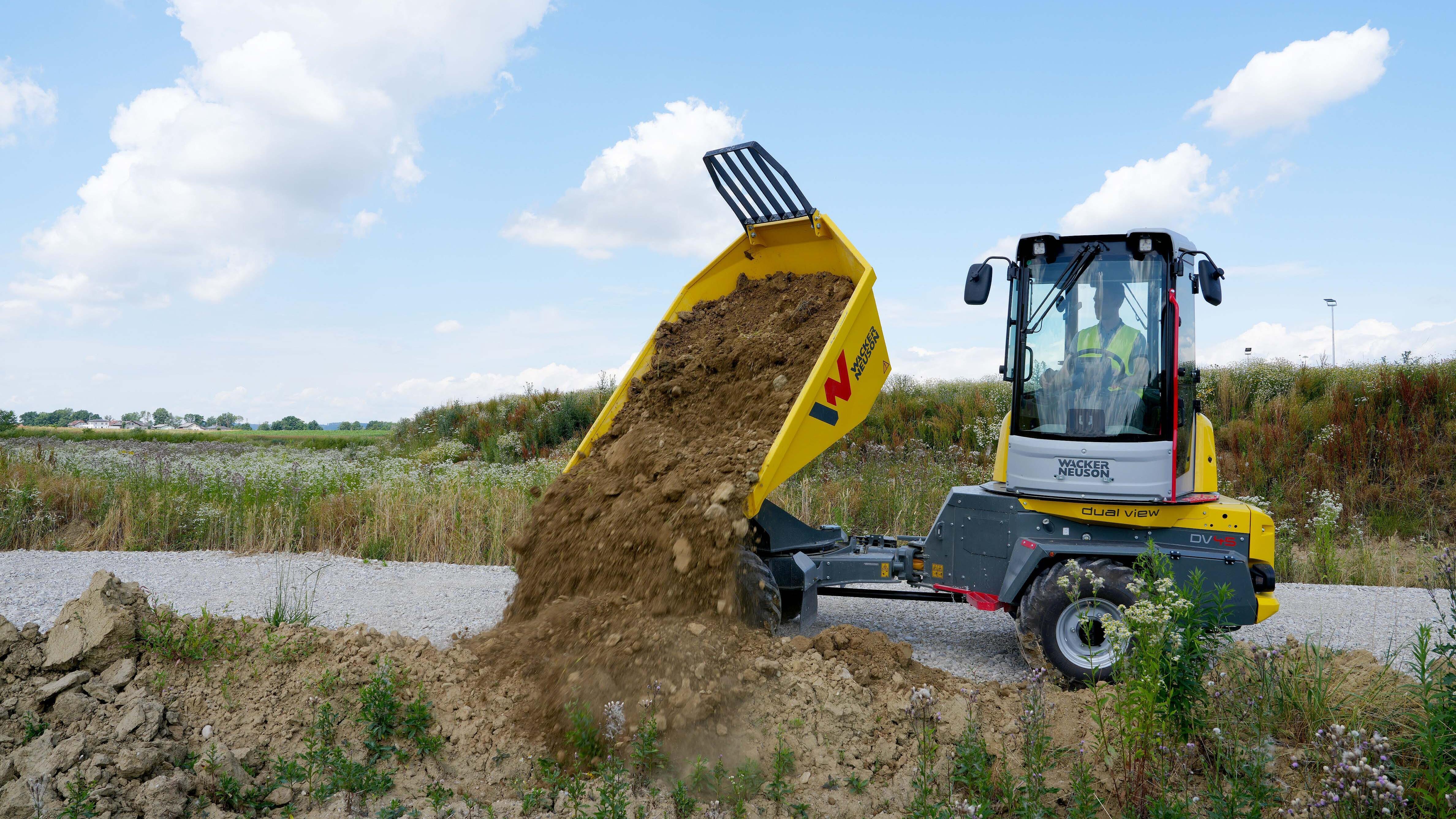Das innovative Konzept der Dual View Dumper, deren Bedienkonsole sich um 180 Grad drehen lässt, hat sich bereits am Markt bewährt. Der Fahrer kann, je nach Bedarf, in Arbeits- oder Fahrtrichtung schauen und hat jeweils freie Sicht. Beim neuen Modell DV45 lässt sich die elektrohydraulisch drehbare Kabine nun per Knopfdruck am Joystick um 180° drehen. Im Multi View-Modus, so wird das Arbeiten bei seitlich gedrehter Kabine genannt, hat der Bediener optimale Sicht auf den seitlichen Arbeitsbereich und sieht punktgenau, wo er das Material auslädt oder sich die Maschine entlang bewegt. Die Muldenrückführautomatik bringt die Kabine auf Knopfdruck automatisch in Ausgangsposition, während sich der Bediener auf das Fahren konzentrieren kann. Die eingebaute Hill-Hold Funktion, eine intelligente Neigungsüberwachung und Sitzgurtüberwachung mit optionaler Startfreigabe, bieten zusätzliche Sicherheit.