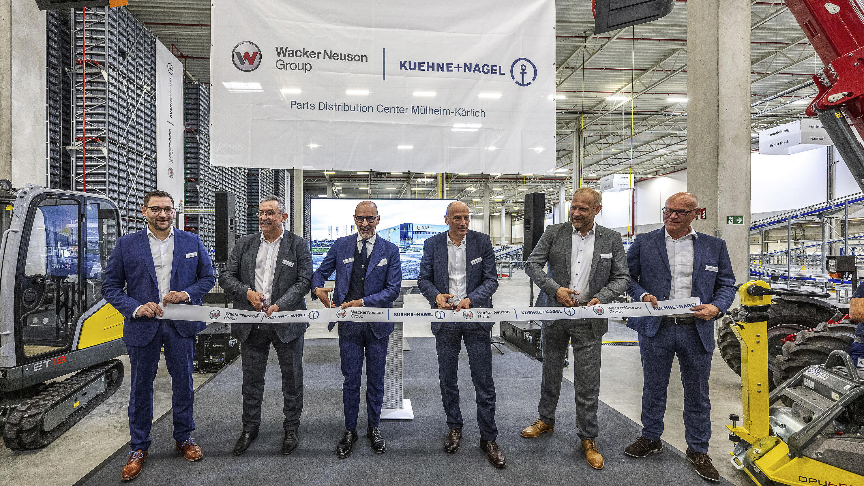 Picture of the opening, persons f.l.t.r.: Christoph Holzberger, Contract Logistics Site Manager, Kühne+Nagel (AG & Co.) KG; Axel Krichel, Mitglied der Geschäftsleitung, Kühne+Nagel (AG & Co.) KG; Gianfranco Sgro, Executive Vice President Contract Logistics Management Board, Kühne+Nagel (AG & Co.) KG; Alexander Greschner, Chief Sales Officer, Wacker Neuson Group; Andrew Voigt, Managing Director Corporate Aftermarket, Wacker Neuson Aftermarket & Services GmbH; Steffen Streubel, Head of Parts Operations, Wacker Neuson Aftermarket & Services GmbH.
